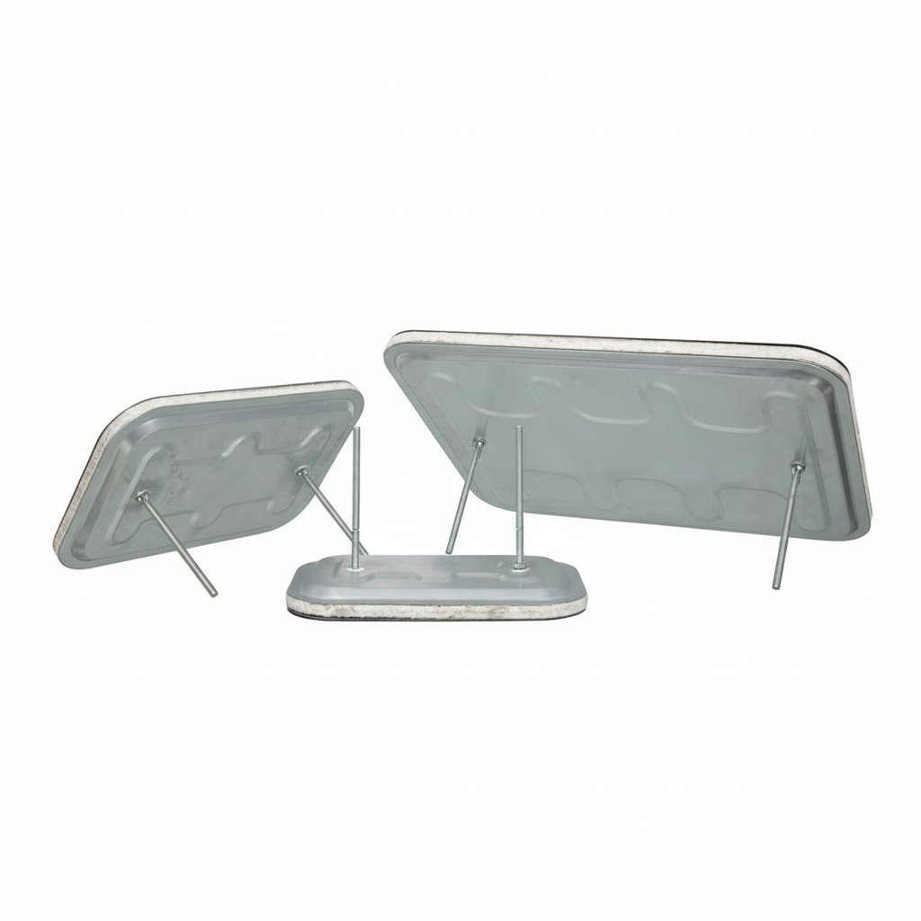 High-temperature flat (or curved) access doors allow users to access the internals of a rectangular duct used for higher-temperature ventilation, such as combustion exhaust or manufacturing ventilation. They generally consist of two doors laminated with heat-resistant metals that, when secured, clamp a high-temperature seal or gasket in place.